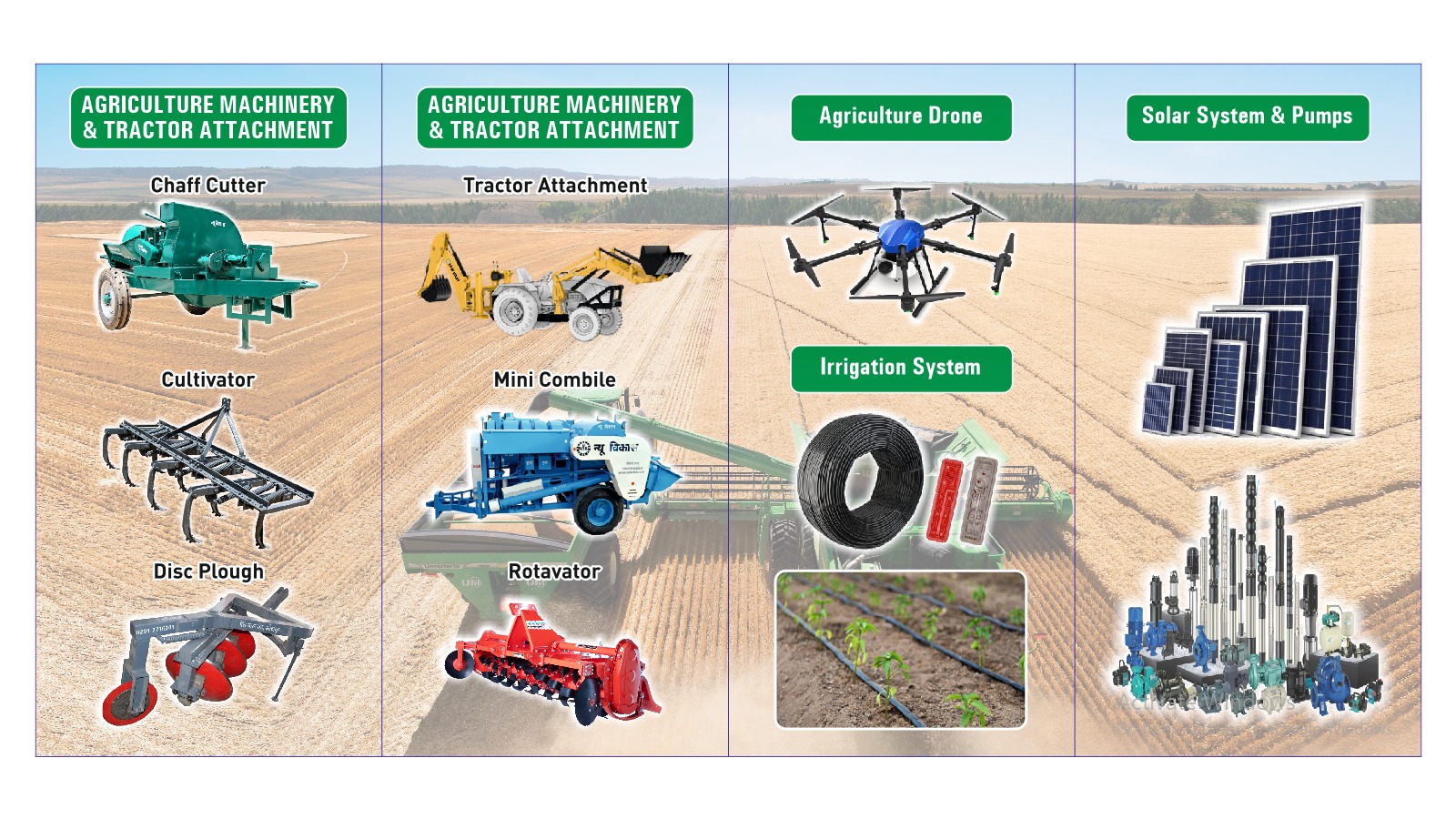 Along with the agriculture implements, the group has pioneered in almost all the verticals of the Farm Machineries and equipment, such as, Irrigation, solar solutions, water pumps, tractors, material handling, etc.